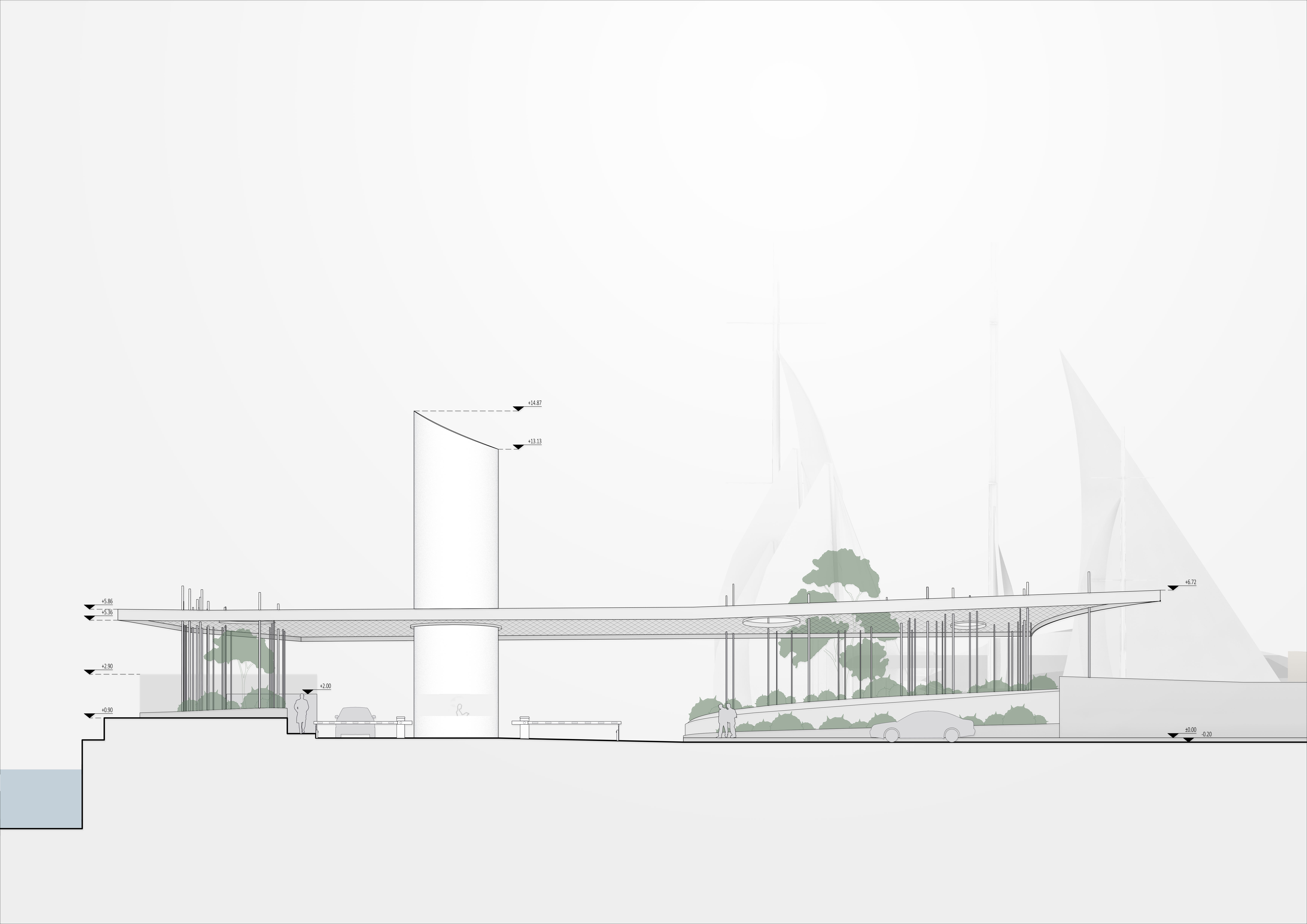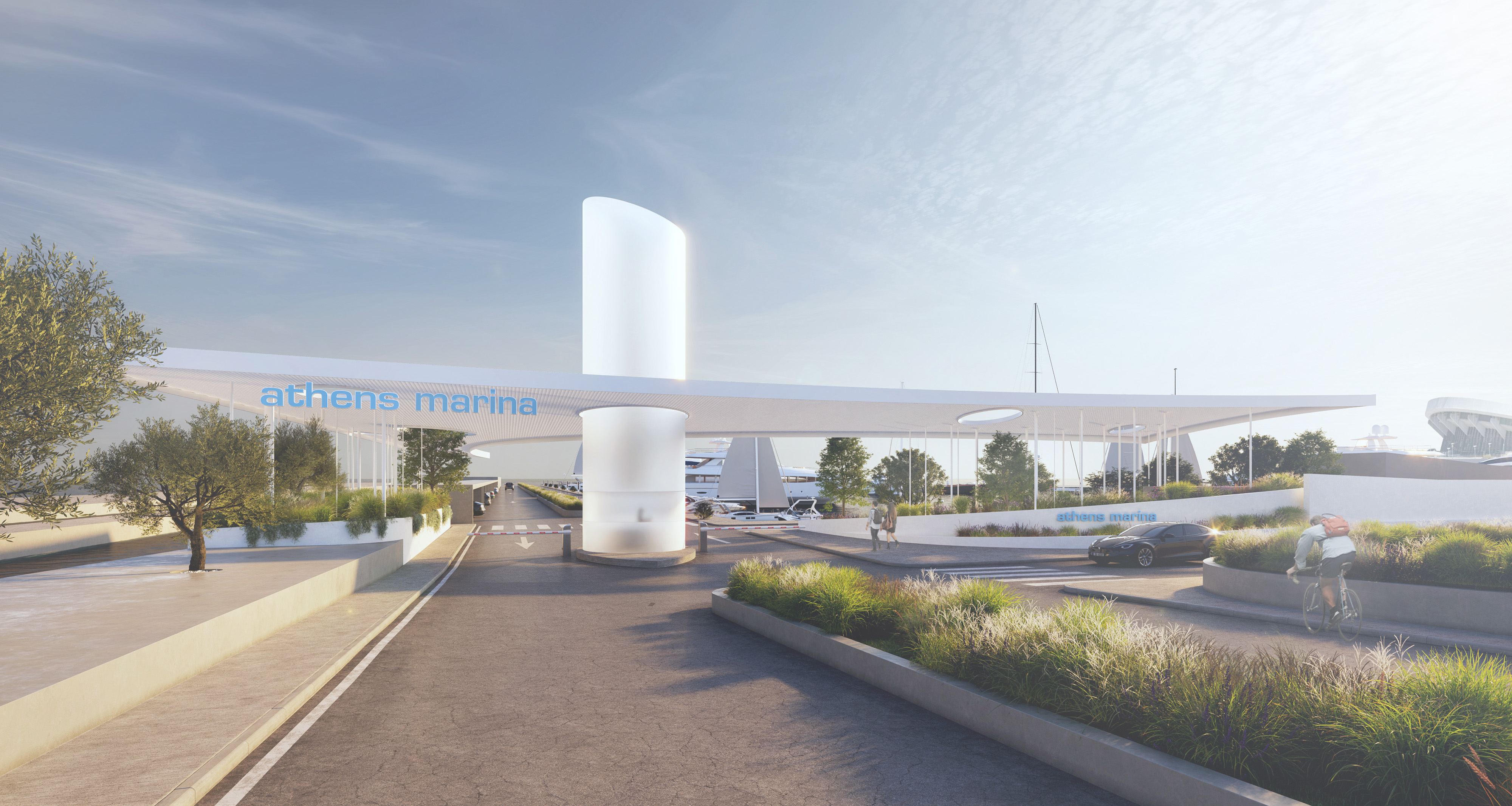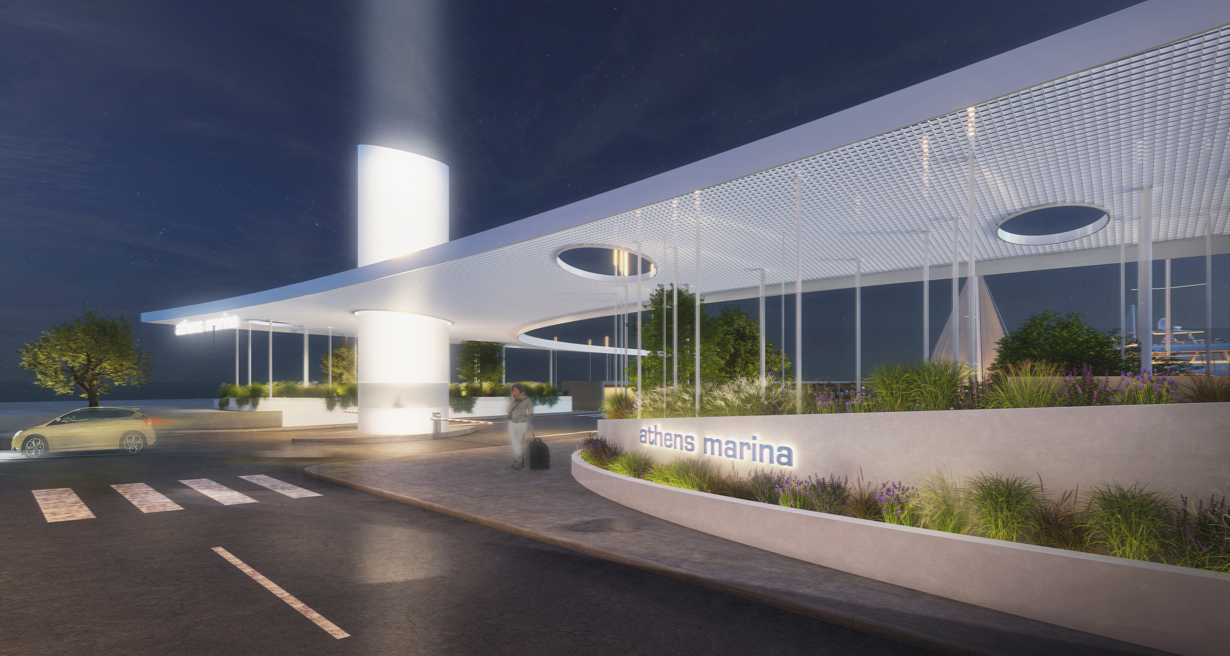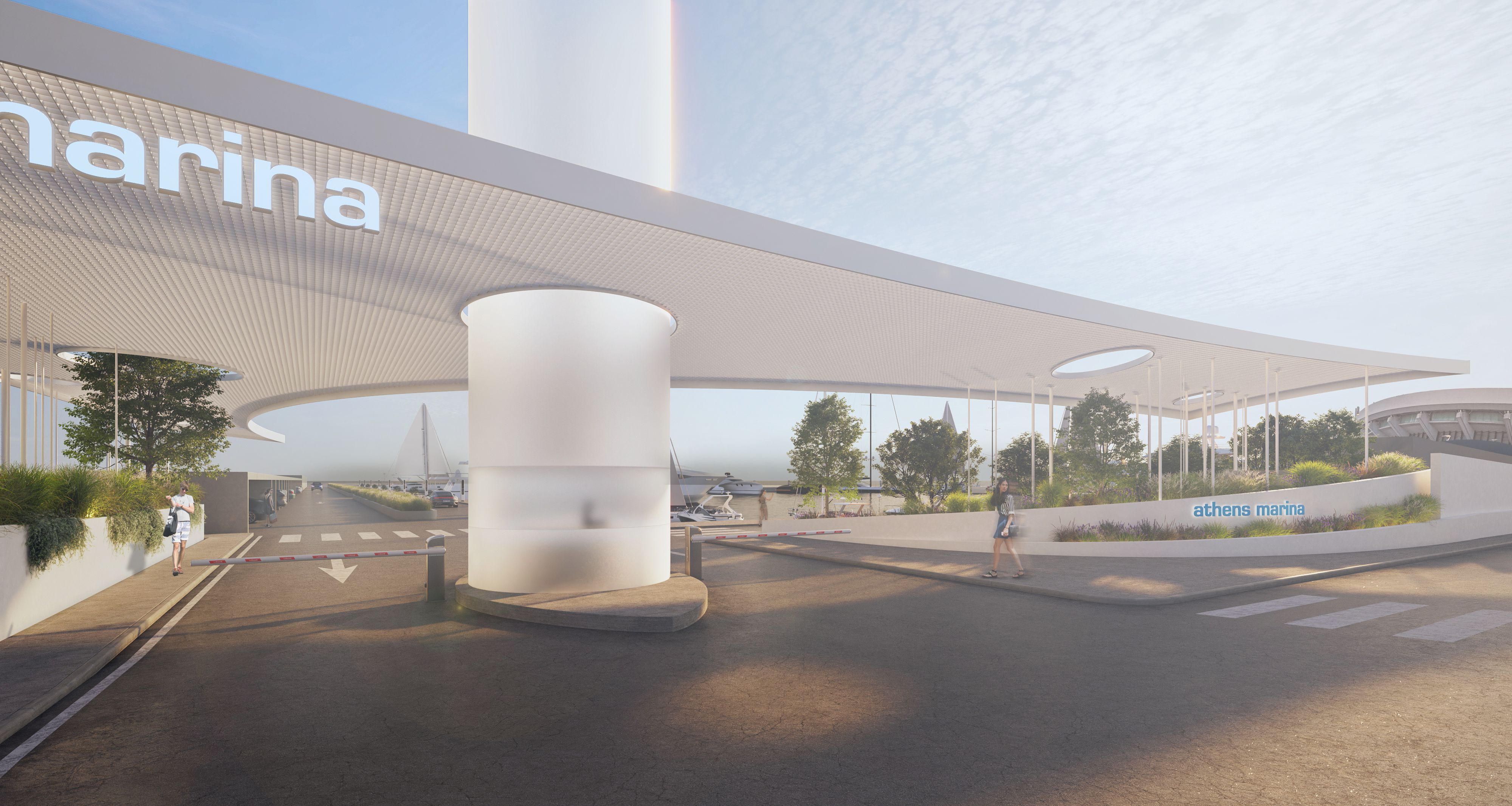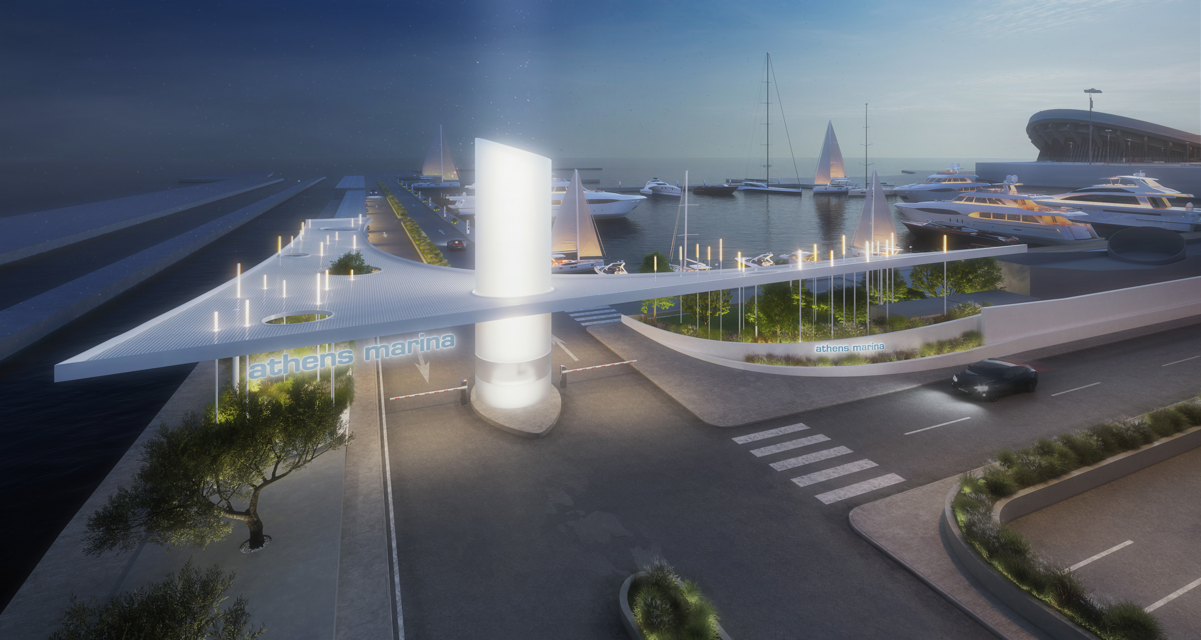 The project is a submission to a closed ideas competition for the redesign of the entrance gate of Athens Marina in Faliro. The proposal introduces a lightweight canopy made of a delicate lattice-like structure, creating a subtle yet distinctive architectural gesture at the marina’s threshold. The canopy is supported by a series of slender vertical elements—columns inspired by the masts of sailing boats—which illuminate at night, marking the entrance with a soft, atmospheric glow.